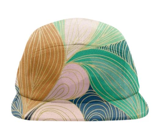 Five panel baseball hat with adjustable nylon strap for sizing.